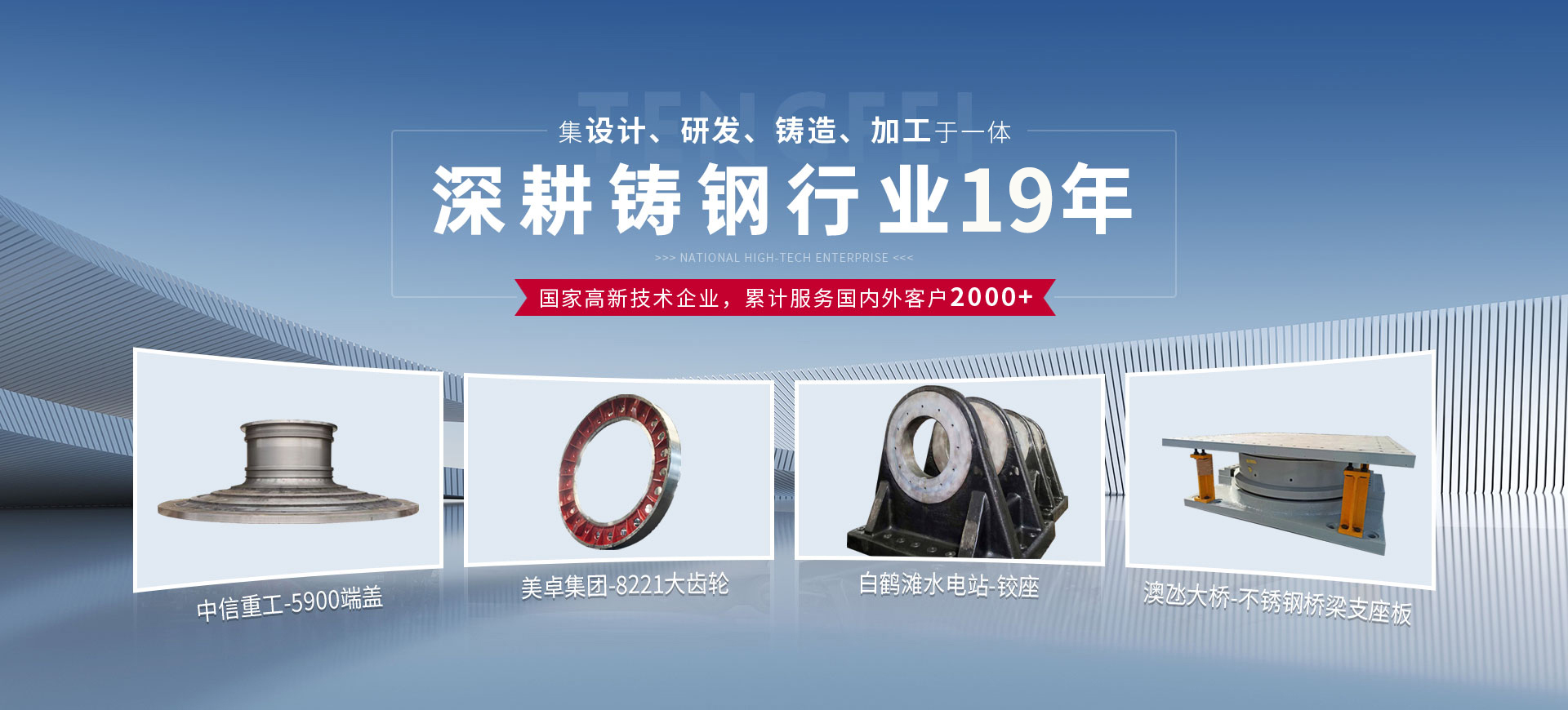 騰飛鑄鋼成立于2006年,位于全國鑄造基地河南省新鄉市,擁有員工300余人,是一家從事150噸以下碳鋼、低合金鋼、不銹鋼鑄鋼件研發、制造、服務為一體的國家高新技術企業?! 」就ㄟ^了ISO9001國際質量管理體系認證,擁有2項發明專 利,2項河南省科技成果、25項實用新型技術,通過了“環??冃гu級B級企業”驗收,先后榮獲“河南省鑄造行業綠色發展企業”、 “河南省科技型中小企業”、“河南省專精特新中小企業”等榮譽稱號。  公司擁有2臺25噸電爐,4臺大型天燃氣熱處理爐、10米回旋自動拋丸機一臺, φ8m數控立車、φ10m數控滾齒機等各類高精裝備100余臺套,年產能3萬余噸,能為客戶提供從產品設計、木模加工、大型鑄造、大型加工一站式服務,產品廣泛應用于建材、冶金、鍛壓、冶金、水工、路橋、化工等多個重型行業?! ¢L期服務于中信重工、中船重工、美卓、上海中交、萊歇、寶武、濟南重工等全球知名企業,在行業內擁有較高的市場知名度和美譽度。